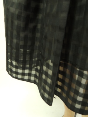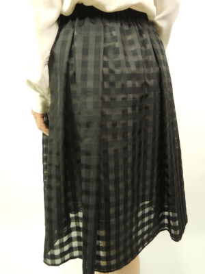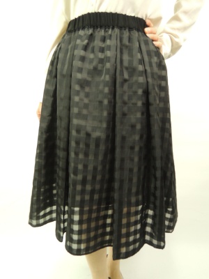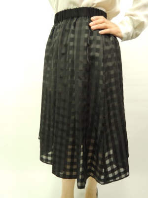 ウエストゴム、ギャザースカート 裏地有、表の生地はあえて長めにして透け感を活かすデザイン。大きなギンガムチェック柄が印象的、ウエストゴムで2サイズ展開