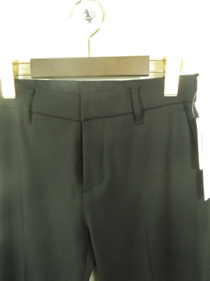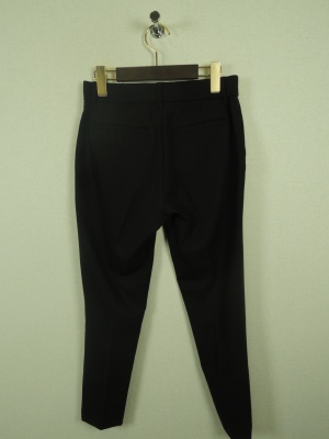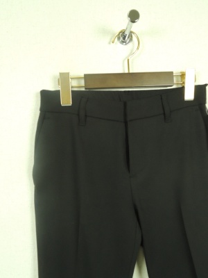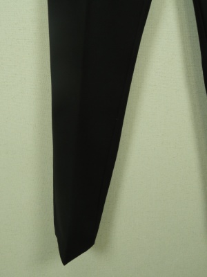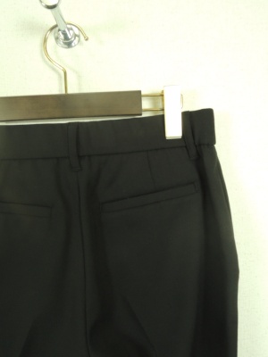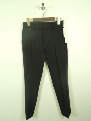 センターライン入りのややテーパード気味のストレートタイプ、くるぶし丈、脇ポケット、裏なし