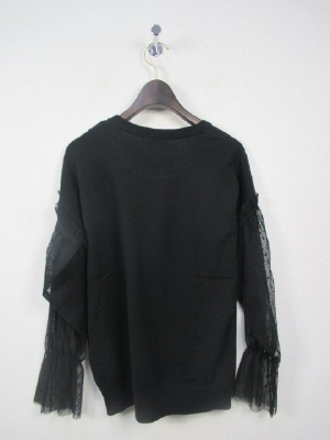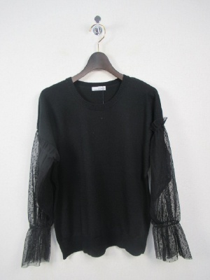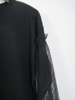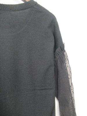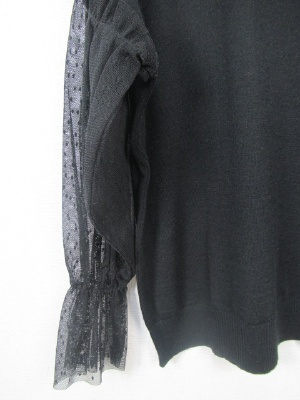 プレーンなまる首ニットにドロップした肩ラインから袖・・チュールレースに細かいドット柄 袖は手首にゴム入り