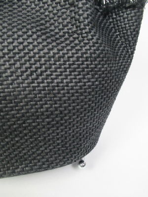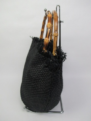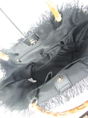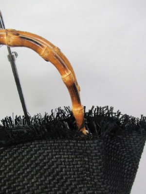 バンブー持ち手、バケツ型、トップはフリンジ、真中中央マグネット留め、内側ポケットあり