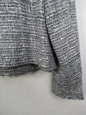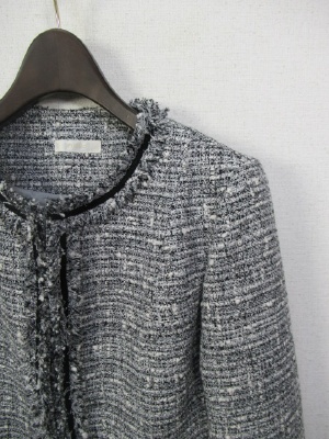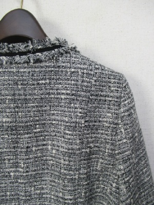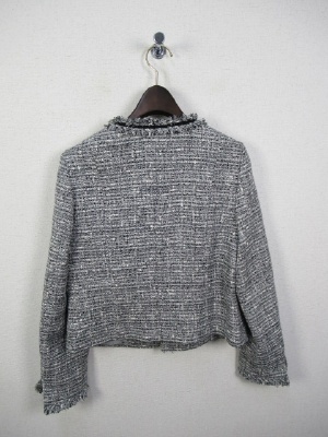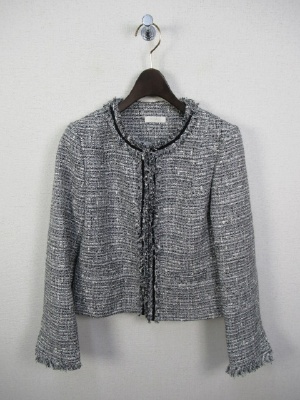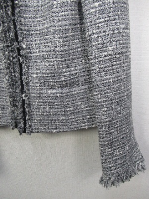 ツィードのシャネルタイプのジャケット、鍵ホック、背抜き、袖はスリットが入り折り返しできます、ポケット付き、前立てと袖口フリンジ