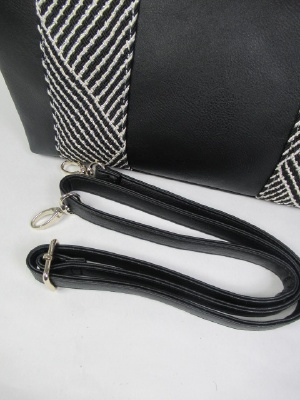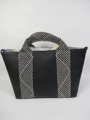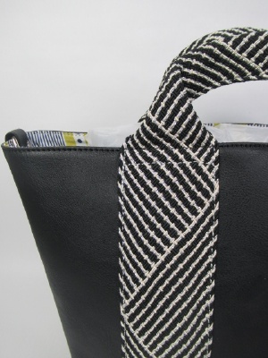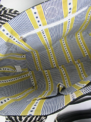 大きなトート型 持ち手から側面に化か手ラメ入りのベルトが飾りに 内側はブルー系と黄色のストライプ柄 持ち手付き