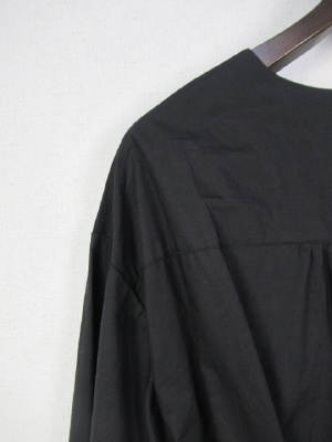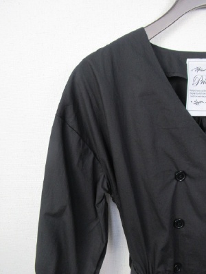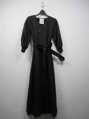 前がダブルボタンのデザインのロングワンピース、袖口はリブ、ID:98644と同型、ウェスト部分は中で紐調整できます、共のサッシュベルト付き(取り外し可能)手洗い可能、七分袖、裏地なし