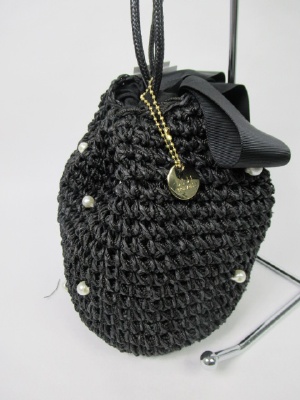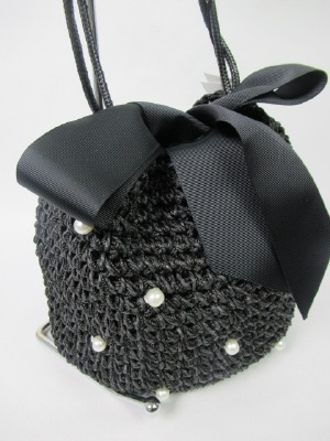 編み、巾着形 おおきなグログランの幅広テープ(どちらも黒色)で絞るデザイン 内側は黒の布で2重に ポケットもあり 表面にパールのパーツで飾り