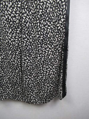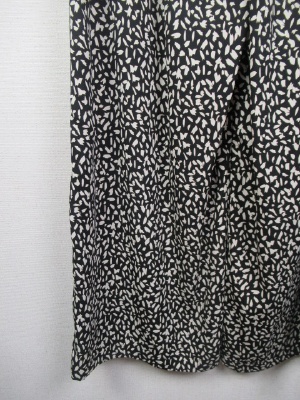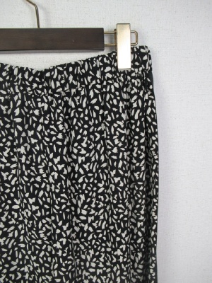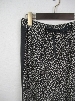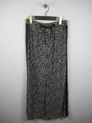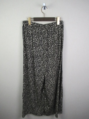 レオパードのようなプリント柄のワイドパンツ、両横にグログランテープのデザイン(テープは両方とも黒)、ウェストは総ゴムでドロストタイプ、裏付き