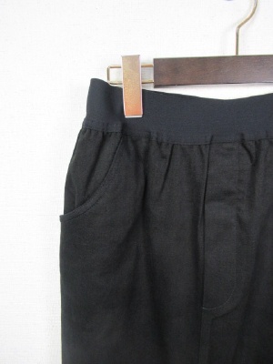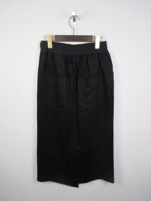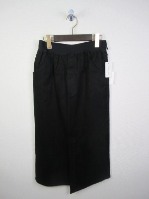 ウェストゴム(黒)のタイトスカート、前スリットデザイン(前裾が長め)、ストレッチ生地、裏なし、手洗い可能