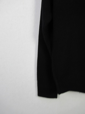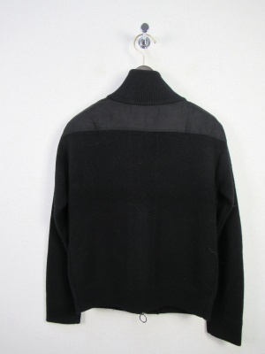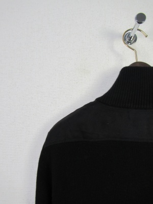 全体にニット地ですが、前立て部分と肩山部分は異素材(ポリエステル100%)になったデザイン(同色です)、前ファスナー(ダブルジッパー)、ハイネック