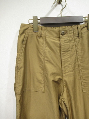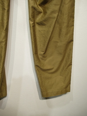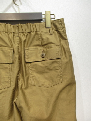 ベイカーパンツ、ややストレート気味、ウェスト後ろゴム入り、前ファスナー、裏地無し、ウェストやや小さめ、生地に光沢有り、手洗い可能