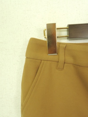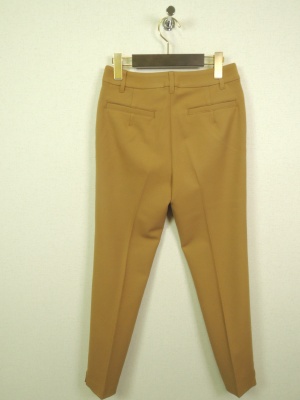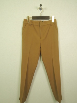 センタープレスのストレートパンツ 裏地なし、裾脇にスリット入り、 ダークブラウン(9号)着用写真