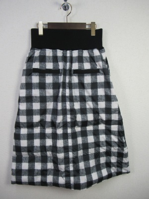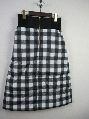 リバーシブルのダウンスカート、ハイウェスト、前ファスナー、裏地は全色チェック柄になります