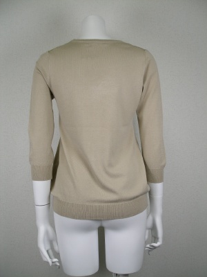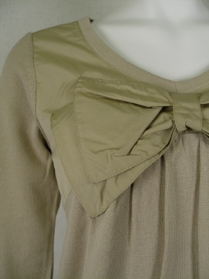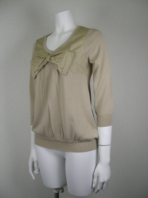 胸元の大きなリボンがポイントの薄手ニット。リボン部分はポリエステル100%で張りのある素材です。