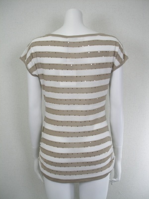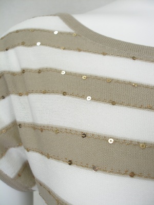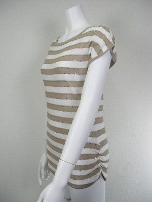 サラリとした素材のロングニット。両脇の裾にシャーリング、ベージュのボーダー部分にはスパンコール。綿55%・ポリエステル45%、着丈61cm。