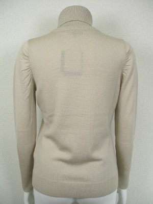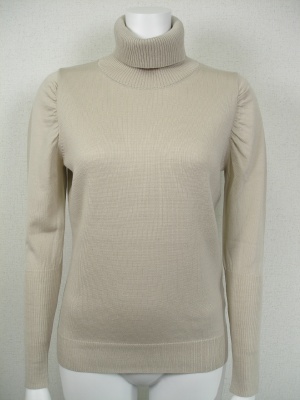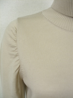 二の腕はゆったり、肘下はリブでぴったりしたお袖で一枚で着ても可愛いニット。ジャケットなどのインナーとしても着まわしやすいタイプです。