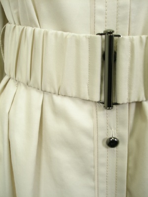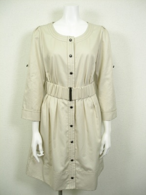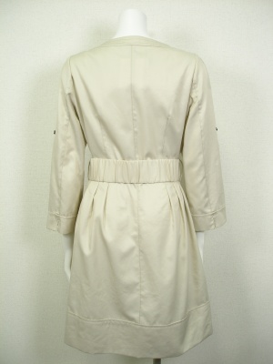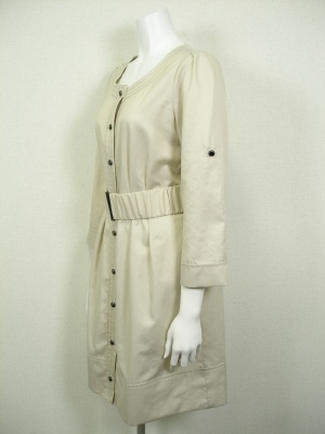 やや光沢のある素材のコートワンピース。ウエストにタックを寄せてあるので、付属のゴムベルトを付けるとキレイです。裏地なし。