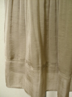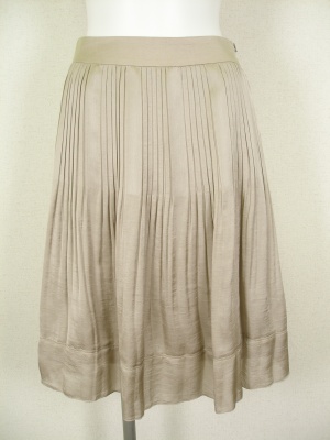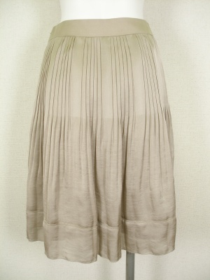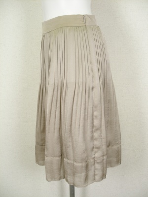 光沢のある薄い素材。プリーツ加工を裾は消して、自然なAラインに。裏地付き。