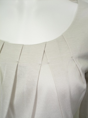 胸元にタックを寄せてややふんわりさせていますが、大きすぎずスッキリしたシルエットです。「ネイビー」のみボーダー柄。