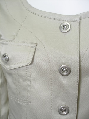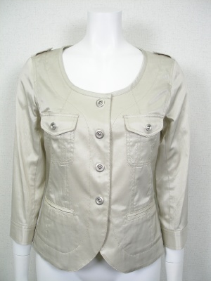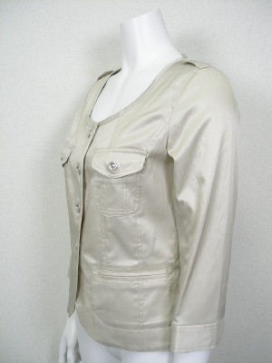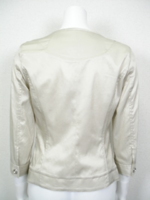 上品な光沢のあるノーカラージャケット。ストレッチの効いた素材なので細身ですが着やすく、スカートにも合わせやすいジャケットです。