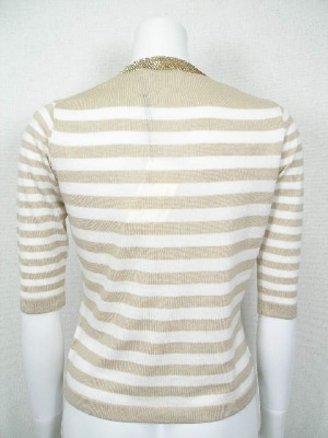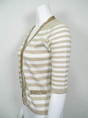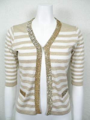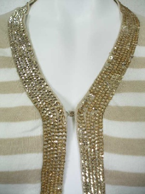 スパンコールでトリミングしたニットカーディガン。生地には引っかからないカギホックを使用しています。
