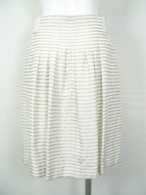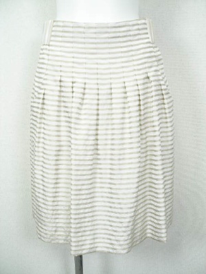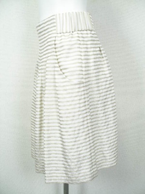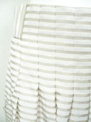ボーダー柄がマリンなスカート。ウエストから13センチは縫い止めで、その下はタックでふわっと広がります。ウエストの両サイドにゴム入り(ボーダーが縦になっている部分)、裏地付き。