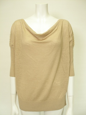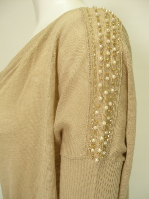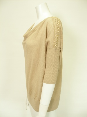 胸元のドレープと肩のビーズがポイントのゆるニット。