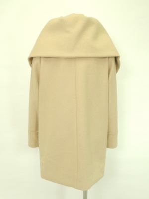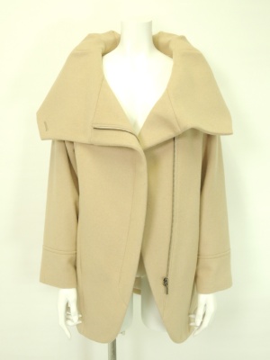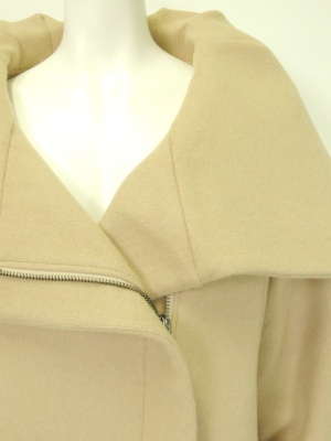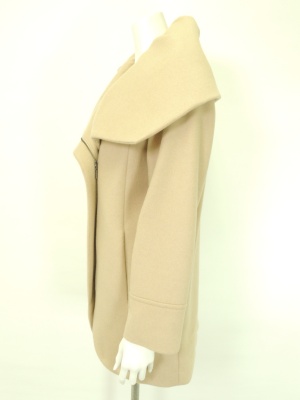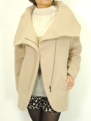大きな衿とサイドに寄せたジッパーのデザインがオシャレなコート。