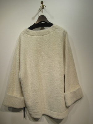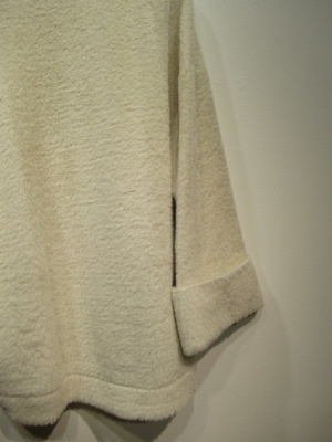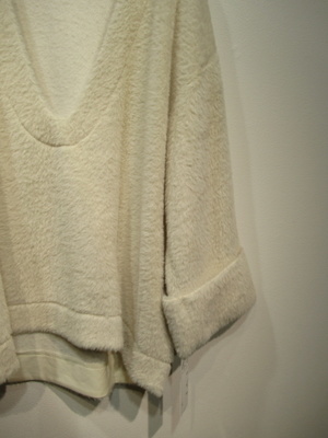 シャギーの生地 ざっくりデザインで大きく空いたV空き 袖筒広め 袖口折り返し タートルニットなど重ね着として