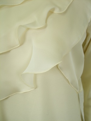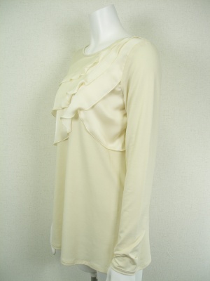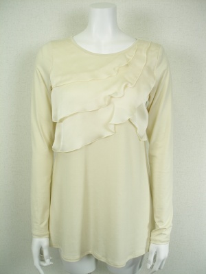 ストレッチの効いたカットソーチュニックに別素材(ポリエステル)のフリルを付けました。フリルと同素材のストール付き。