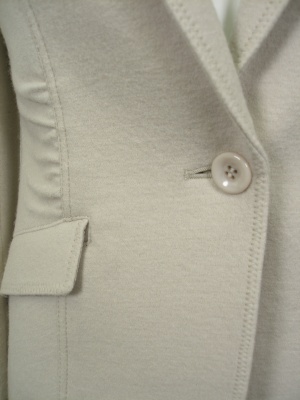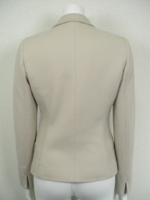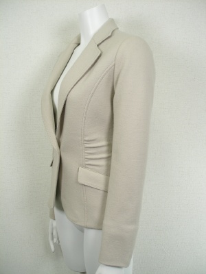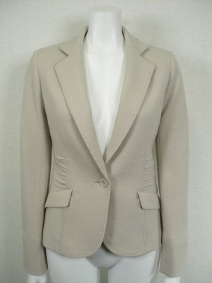 タイトなデザインとウエストのギャザーでスッキリ見せるジャケット。裏地付き。お勧め商品(下の欄)のスカートとパンツは同じ素材ですのでスーツになります。