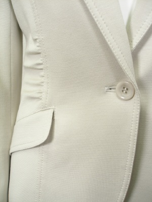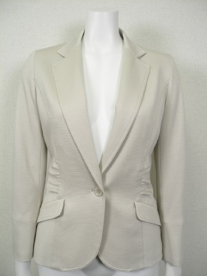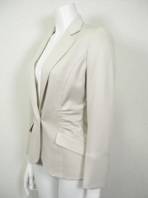 ウエストシェイプした細身のテーラードジャケット。さりげないギャザー使いがほっそり見せてくれます。