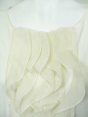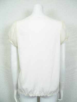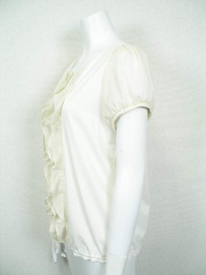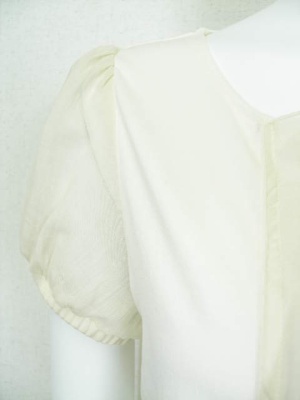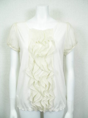 フリルたっぷり、フェミニンなカットソー。お袖とフリルは布帛でほんのり透けます。袖口と裾にはゴムをいれ、ふんわりしたシルエットに。