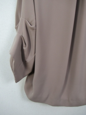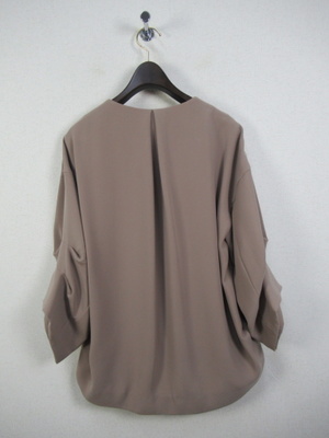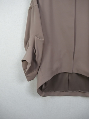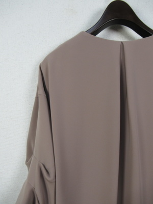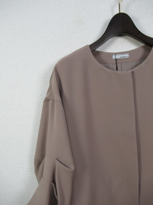 コクーン型後ろが長め襟なしジャケット ドロップショルダーで身幅広め 袖・・2段階でタック入 大きなホックで3箇所フロント留め 裏地有り