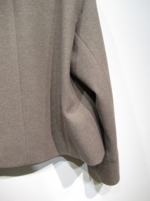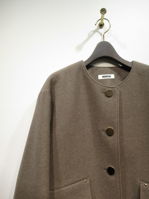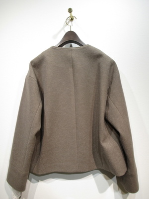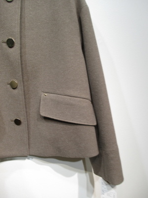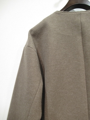 襟なしショート丈コート、ドロップショルダー、大きなボタンが特徴、裏地あり