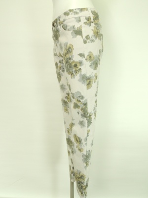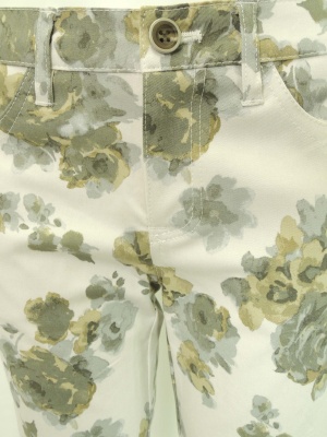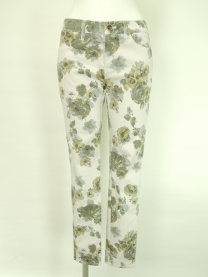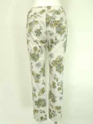 水彩画のような花柄のタイトなパンツ。