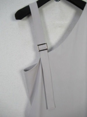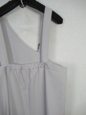 アシンメトリーデザインのジャンバースカート 肩紐長さ調整できます 裏地なし 左脇にファスナー 後ろギャザーゴム スリット(28cm)入り 手洗い可能