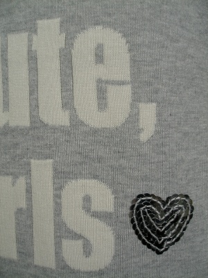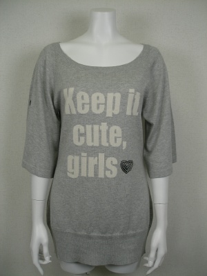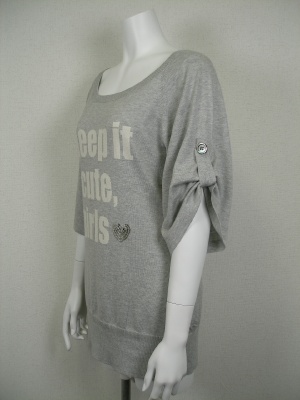 ロング丈のロゴニット。ハートの部分はスパンコールです。七部のお袖はくしゃっとロールアップしても。
