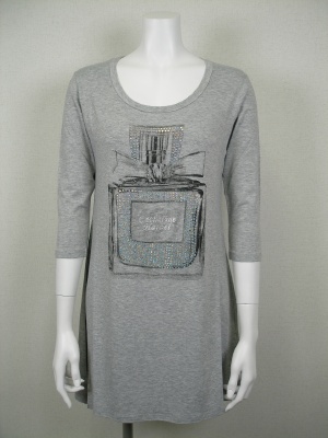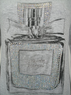 香水瓶のプリントはキラキラのラインストーン付き。生地は柔らかくストレッチが効いています。
