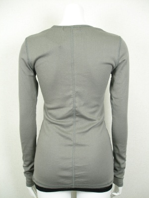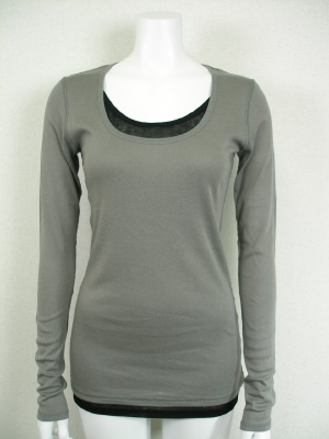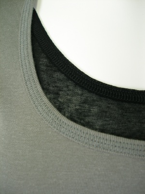 胸元と裾に違う色の生地を重ねて、タンクトップを重ね着しているみたいに。長めの着丈や袖が重ね着に便利です。