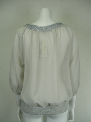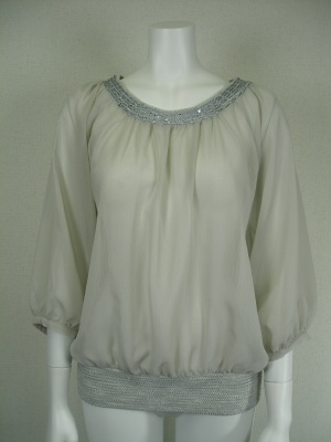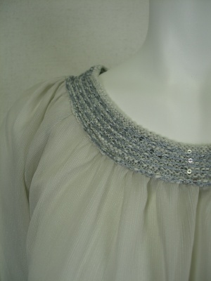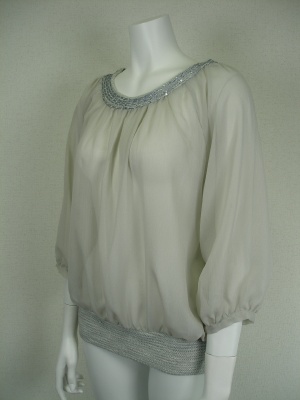 透け感のあるふんわりブラウス。衿周りと裾はツイード地の若干伸縮のあるニットを用いてブラウジングしやすい。