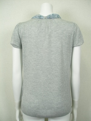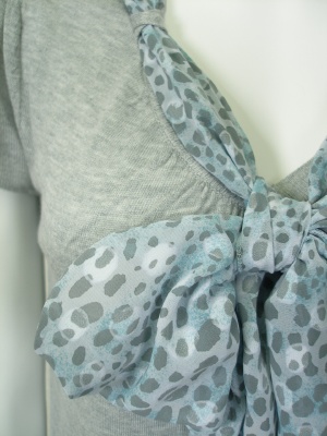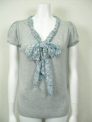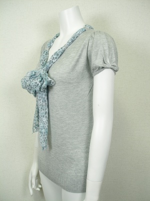柔らかい素材のVネックニット。ネックラインのループにアニマル柄のスカーフ(ポリエステル)を通してあります。