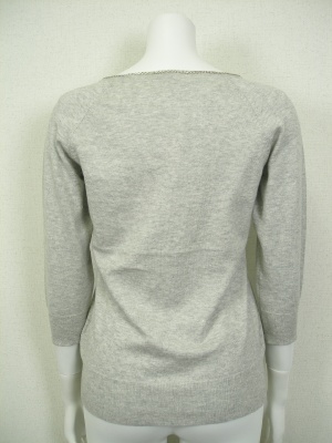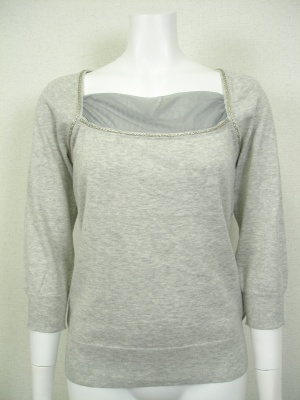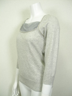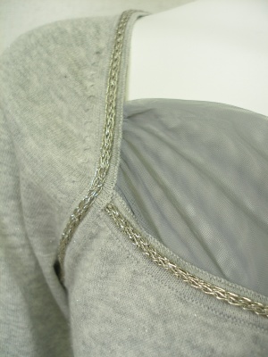 スクエアカットのニット、胸元のシフォン地がオシャレ度をアップ、トリミングにラメ糸を使ってよりシフォンを際立たせる