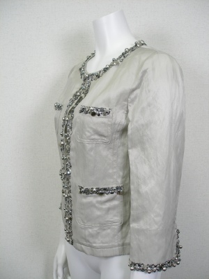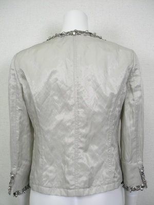 やや光沢があり自然なシワ感のあるジャケット。スパンコールやメタルパーツを使っています。裏地なし。