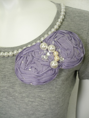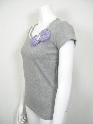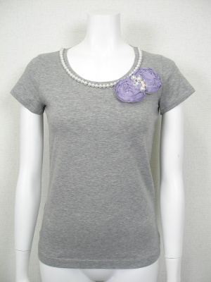 大きめパールと立体感のあるコサージュがカワイイTシャツ。ストレッチの効いた素材です。