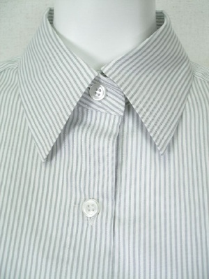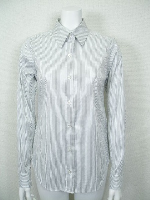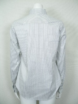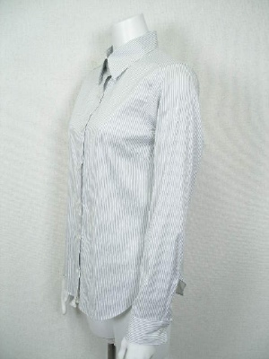 しトレッチの効いたストライプのシャツ。ID75615と同じ形で素材違い。両サイドの裾にボタンとボタンホールがあり、留めるとカシュクール風にアレンジできます。