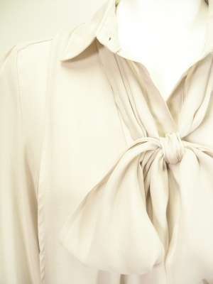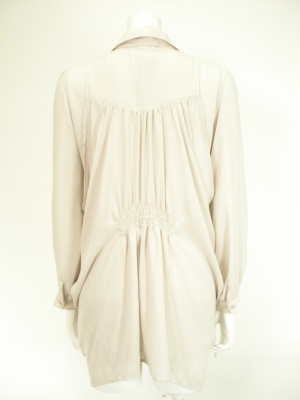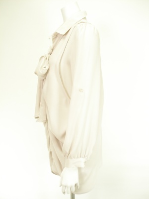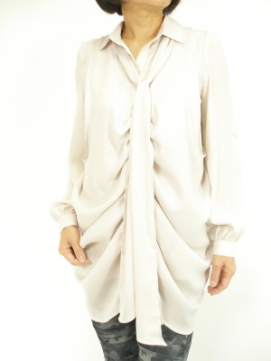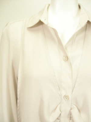 ゆったりしたシャツに同じ生地のドレープベストを重ねたデザイン。