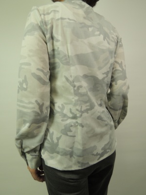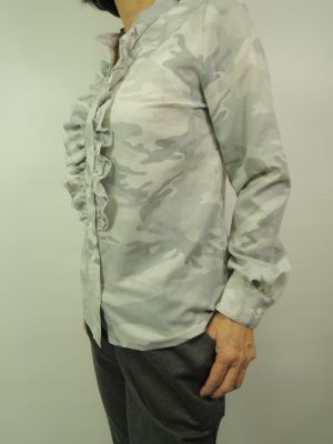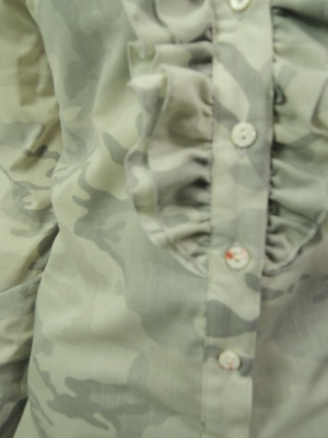 淡い色の迷彩柄、前開き、フリル有 スタンドカラー