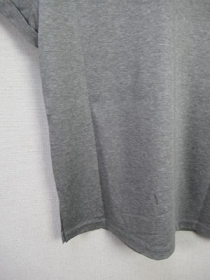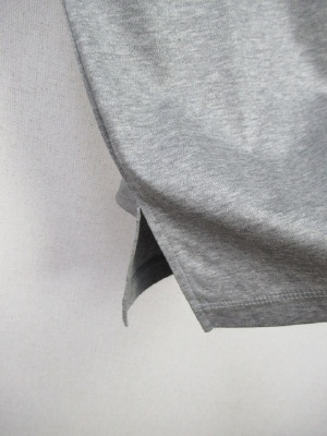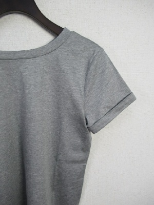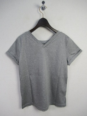 前後着用できるカットソー、丸首が前になります、後ろはVネック、着丈の長さは後ろがVネックの場合で測ってます、丸首が後ろだと52pになります、手洗い可能、袖はダブルになっていて脇にスリット入り