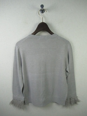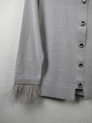 袖には取り外し可能な(ホックで)羽がついたデザイン、前ボタンはグレー系のガラスボタン