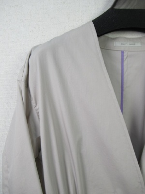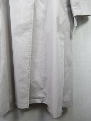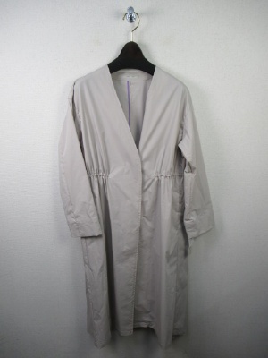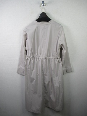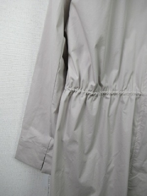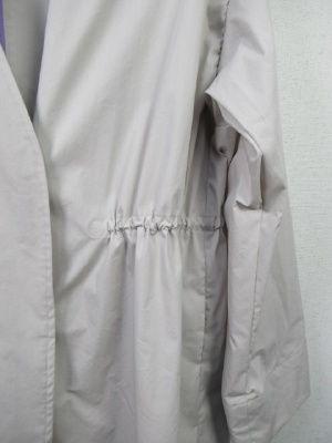 ノーカラーのスプリングコート、前ボタン2つ、ウェスト部分ゴムでギャザー(調節可能)やや前上がり、両横脇ポケット、袖口スリットで折り返し可能