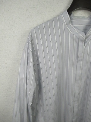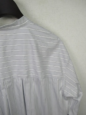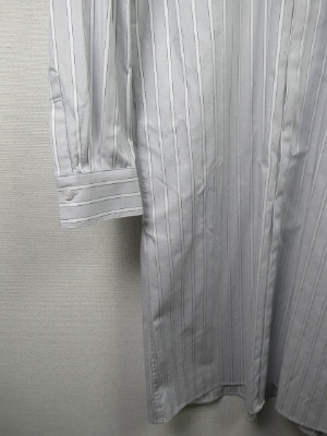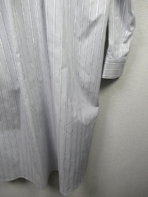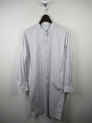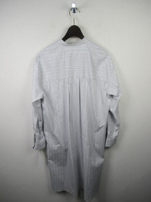 ストライプのロングシャツ(白はネイビー・グレーは白)、比翼ボタン、ノーカラー、脇ポケット、後ろ身ごろ切り替えあり