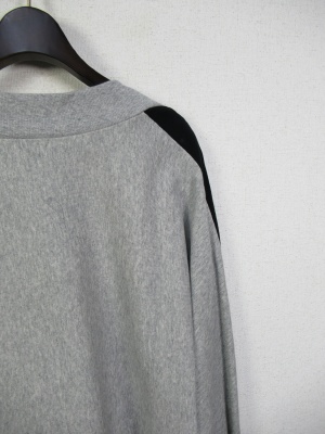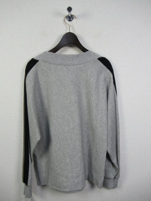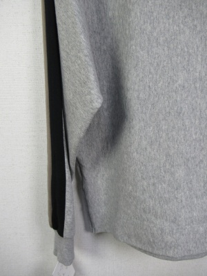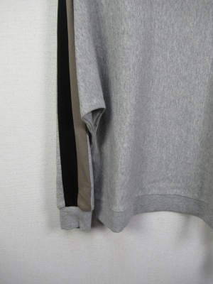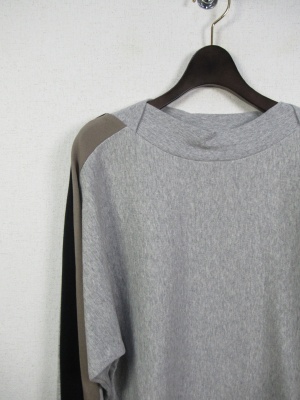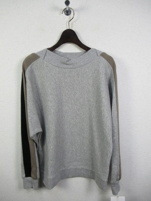 裏毛のカットソー ややボートネックに近い横に広く開いたネックライン 袖山に色違いで2色ライン入り 変形ラグラン袖で身幅が広くなる バストラインより裾周りを測る 手洗いOK